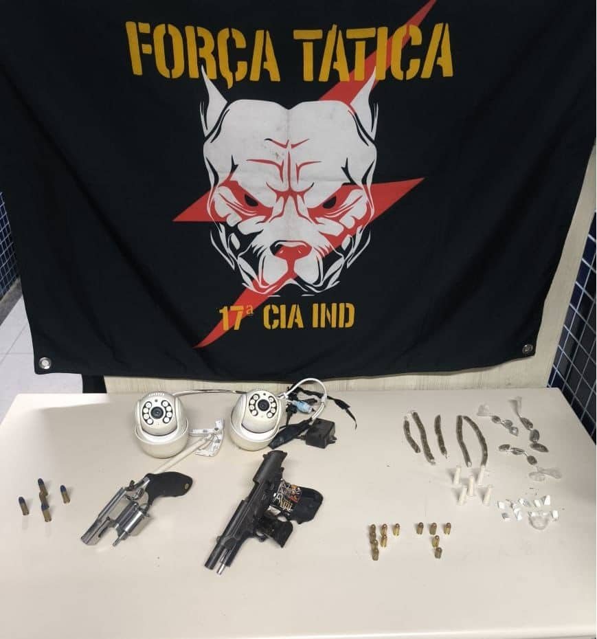 Durante as buscas no imóvel, os policiais apreenderam uma sacola contendo unidades de maconha, haxixe e cocaína, além de um revólver calibre 38, municiado